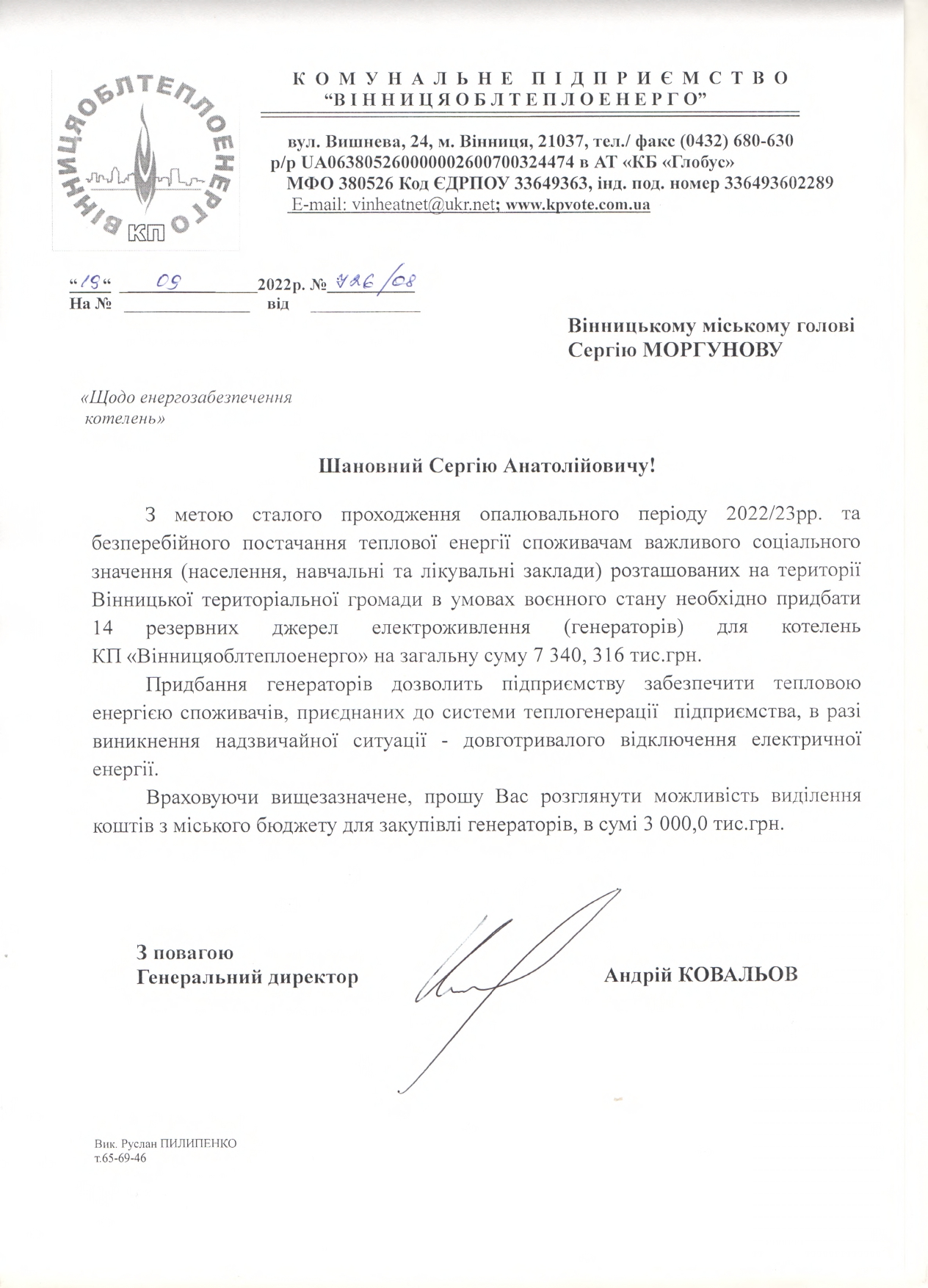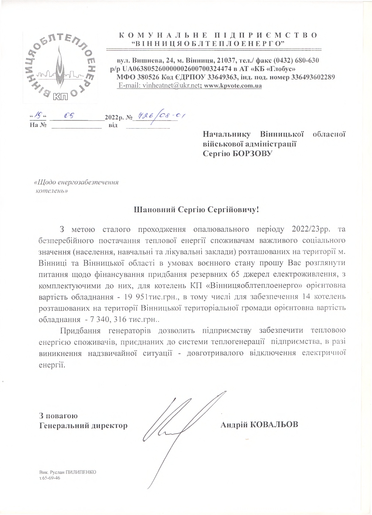 З метою забезпечення безперебійного постачання теплової енергії споживачам, зокрема населенню та закладам соціальної сфери м. Вінниці й області в умовах воєнного стану, генеральний директор КП «Вінницяоблтеплоенерго» Андрій Ковальов звернувся з офіційними листами до Вінницького міського голови Сергія Моргунова та начальника Вінницької обласної військової адміністрації Сергія Борзова. Очільник підприємства висловив прохання розглянути можливість фінансування закупівлі для котелень КП «Вінницяоблтеплоенерго» резервних 65 джерел електроживлення з комплектуючими до них, в тому числі, для забезпечення 14 котелень розташованих на території Вінницької громади.